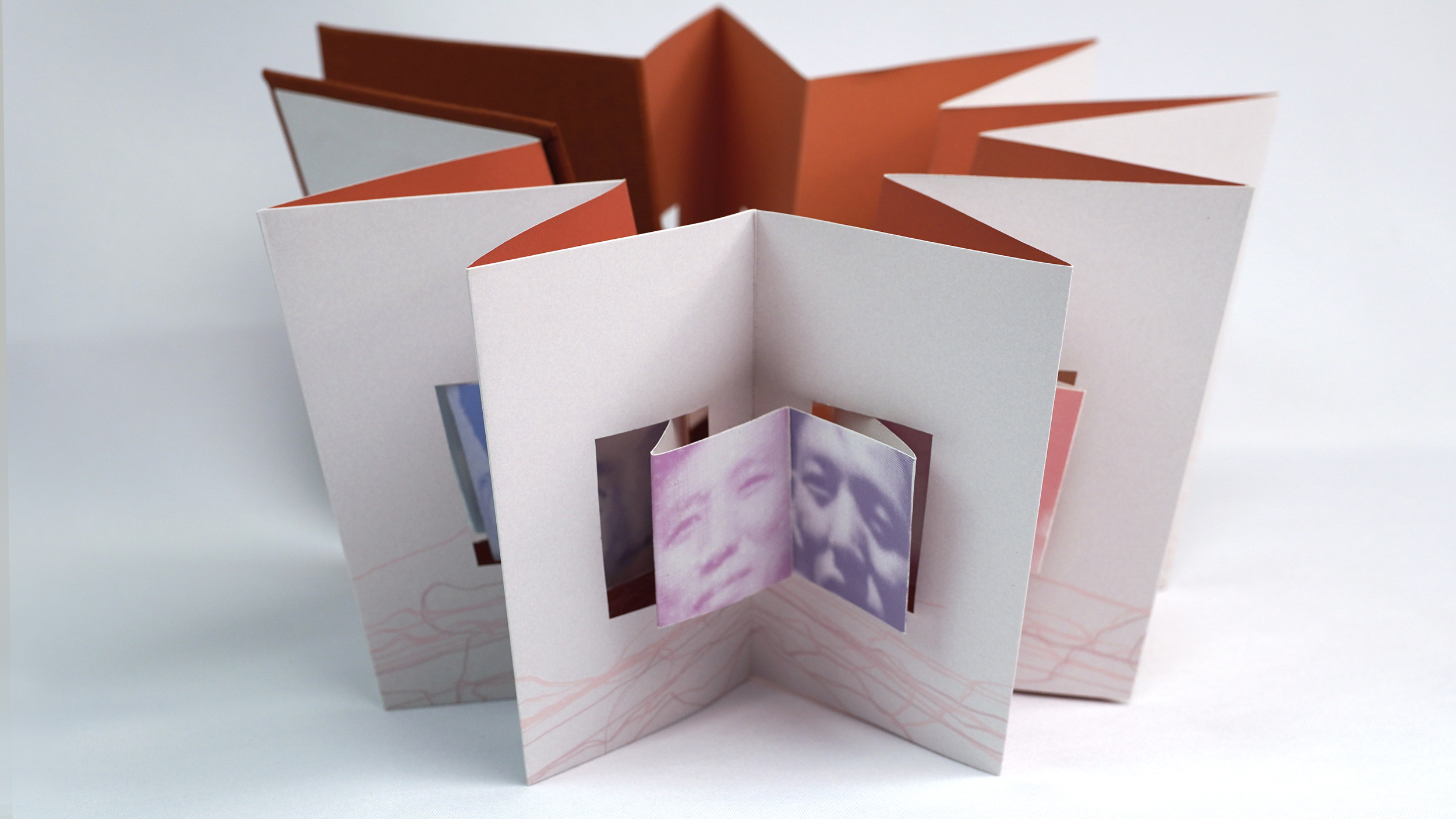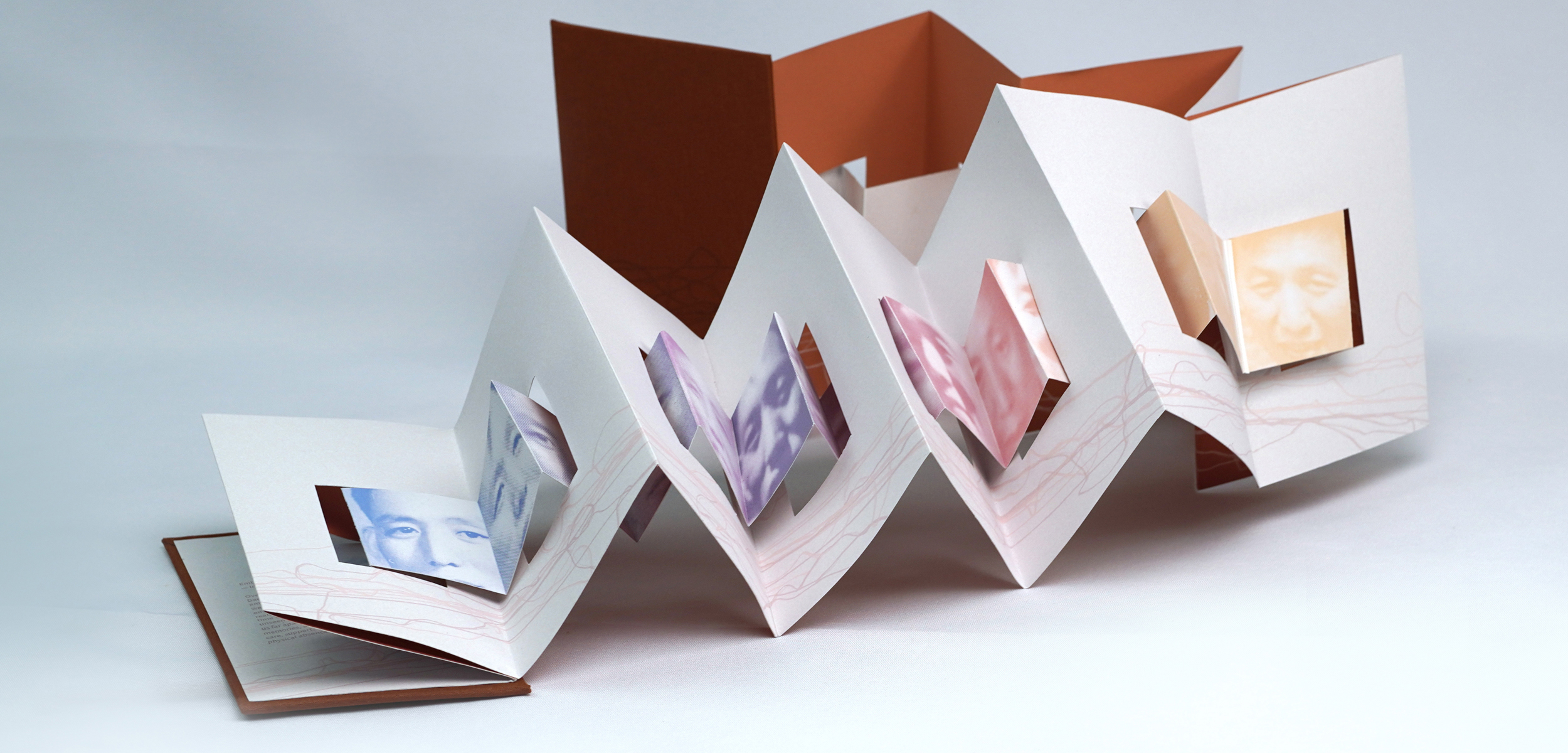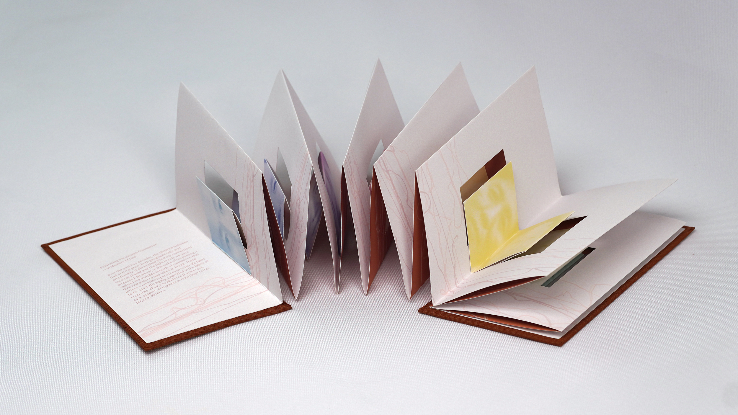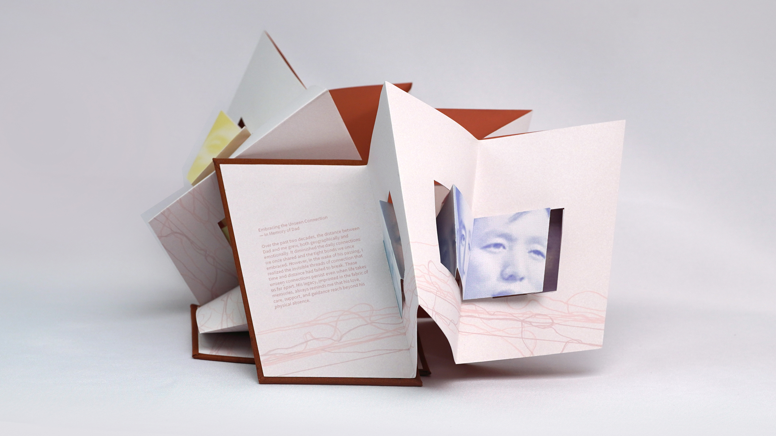 Created in memory of my father, this project explores the complex interplay of emotional distance, the passage of time, physical separation, and enduring familial bonds over the past two decades. The primary images are created using various threads, symbolizing the unbreakable connections between us. The book's pages feature interrelated images and die-cut windows that form the shape of a Chinese lantern, a symbol of joy, memories, and family ties. Through the combination of personal narratives, meaningful imagery, abstract forms, and symbolic structures, this project aims to foster a sense of shared humanity and cultural understanding.